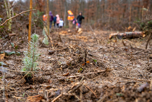 © AGDER, Fototapeta premium Gros plan sur un petit pin maritime tout juste planter en forêt
