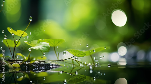© FlyStun, Obraz premium Gros plan sur un point d'eau avec de la végétation. Goutte d'eau sur une flaque, un lac, une marre. Avec des feuilles, branches. Arrière-plan bokeh de la nature.