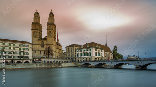 Obraz premium Grossmünster Cathedral in Zürich, Switzerland. Long Exposure of the Grossmünster Cathedral and old town from Limmat river.
