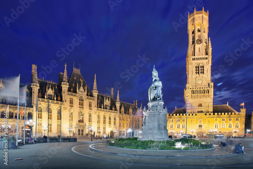 © Thomas, Fototapeta premium Grote Markt w Brugii o niebieskiej godzinie