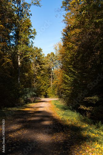 © michal812, Obraz premium Ground path through a forest during sunny day in autumn