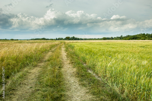 © darekb22, Obraz premium Ground path through fields and gray clouds and sky
