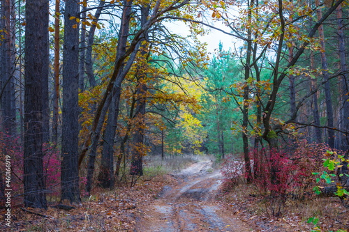 © Yuriy Kulik, Fototapeta premium ground road in red dry forest, quiet autumn forest