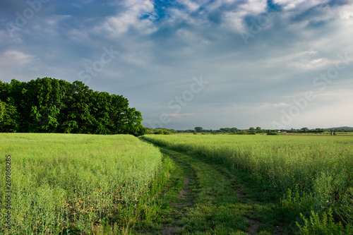 © darekb22, Fototapeta premium Ground road through a green growing field of rape, trees and clouds on a sky