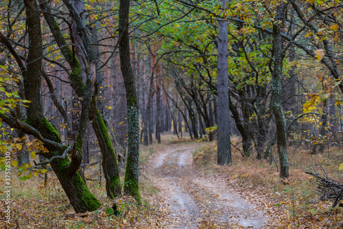 © Yuriy Kulik, Fototapeta premium ground road through quiet autumn forest, outdoor natural background