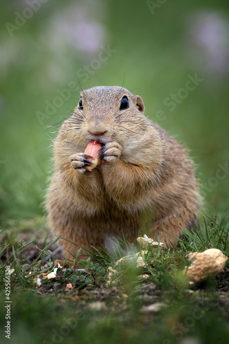 © Martin, Obraz premium Ground squirrel on a green field looking out of a burrow