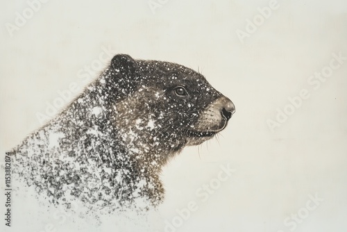 © Infusorian, Obraz premium Groundhog covered in snowflakes during snowfall