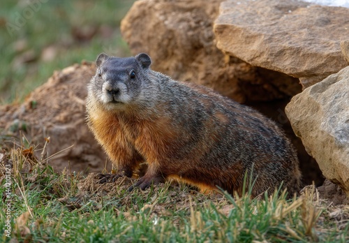 Naklejka premium Groundhog emerges from burrow in a grassy area, displaying its brown and gray...