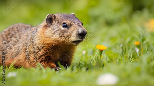 © Hanna Ohnivenko, Fototapeta premium Groundhog (Marmota monax), also known as a woodchuck, feeding on grass during summer. Selective focus, background blur and foreground blur. Copy Space