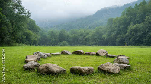 Obraz premium Grounding stone circle in serene forest clearing surrounded by lush greenery and misty mountains