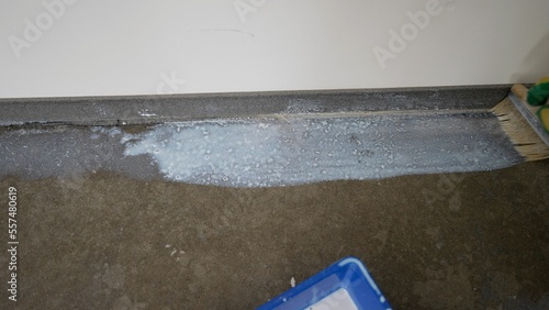 Naklejka premium Grounding the floor, preparing the floor for laying mortar. A worker applies a primer to the floor with a brush.