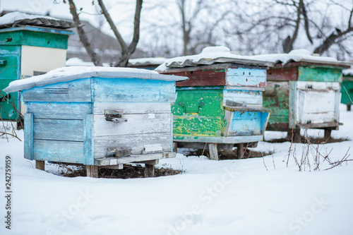 Naklejka premium Group beehives in the winter garden with snow covering.