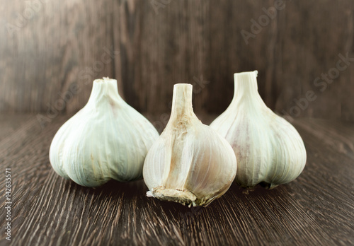Obraz premium Group bulb Head of garlic on wood background with shadow