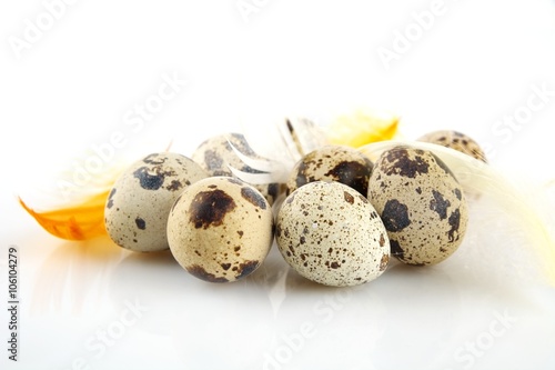 © T. Wejkszo, Obraz premium Group easter quail eggs on white tablecloth with feathers
