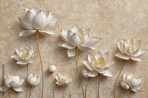 Fototapeta premium Group nine white lotus flowers arranged row beige A sculpture of