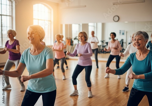 Naklejka premium Group of active senior women smiling while exercising together in a bright...
