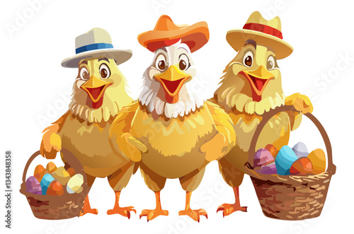 Obraz premium Group of adorable smiling chickens in funny hats surrounded by Easter baskets, vector illustration on white background.