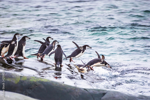 Fototapeta premium Group of adult Chinstrap Penguins diving in the sea from their colony for feeding or foraging on krill in the Antarctic Peninsula, wildlife, Antarctica