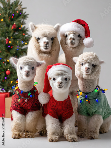 Obraz premium Group of alpacas wearing Christmas sweaters and Santa hats, festive lights, standing near decorated tree, joyful holiday scene