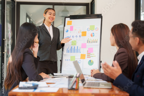 Fototapeta premium Group of Asian businessmen are sitting in a meeting, talking, exchanging knowledge. Presentation about office work
