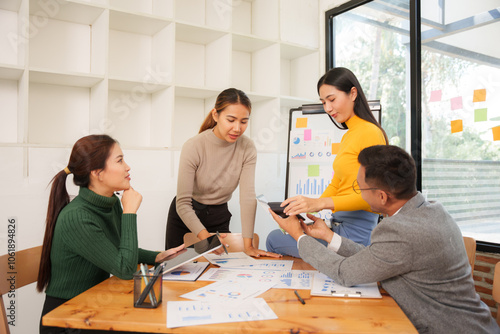 Fototapeta premium Group of Asian businessmen are sitting in a meeting, talking, exchanging...