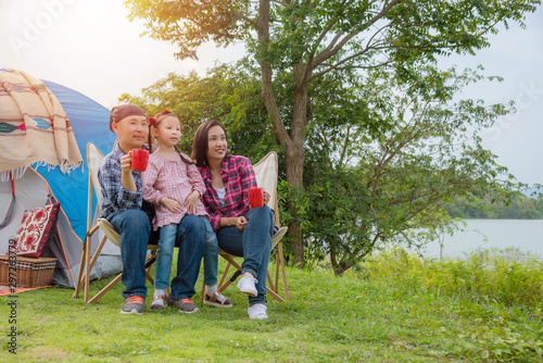 Obraz premium Group of asian family travel and camping at lakeside in forest ,sitting all...