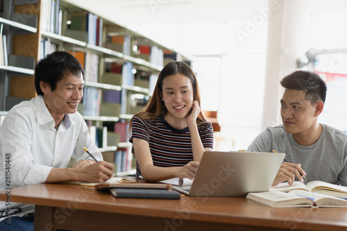 © Pormezz, Fototapeta premium Group of asian students researching for project in library of university.