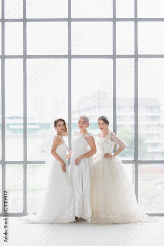 Naklejka premium Group of beautiful Asian brides stand and poses..