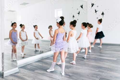 Naklejka premium Group of beautiful little girls practicing ballet at dancing class.