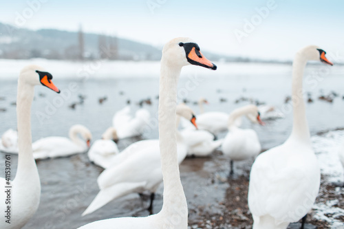 Obraz premium Group of beautiful white swans on riverside in winter day.