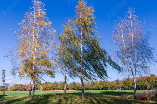 Fototapeta premium Group of birches with autumn leaves on edge of big lawn