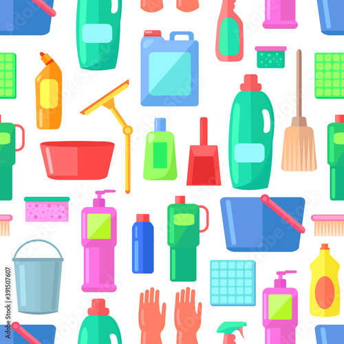 © robu_s, Obraz premium Group of bottles of household chemicals, supplies and cleaning, tools and containers for cleaning. Icons set of multicolored plastic flasks from chemical detergents, mops, buckets, basins, brushes