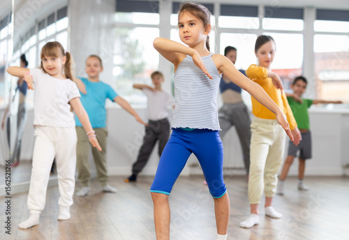 Fototapeta premium Group of boys and girls rehearsing modern dance in studio