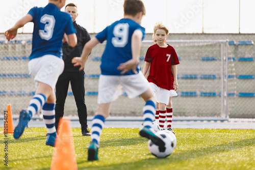 Fototapeta premium Group of boys attending soccer football training on a school grass pitch. Man...