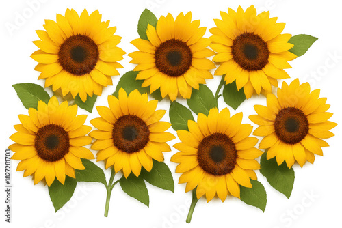 © Michael, Fototapeta premium Group of bright yellow sunflowers with green leaves creating a vibrant floral display, transparent background composition
