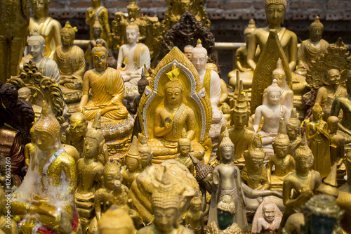 © mckaphoto, Fototapeta premium Group of Buddha image in public temple on Songkran Festival