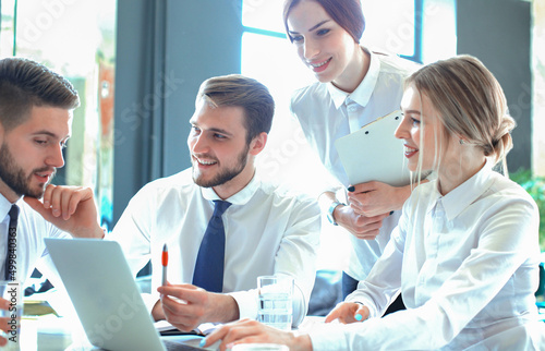 Obraz premium Group of business partners discussing ideas and planning work in office.