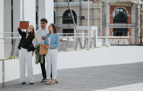 © qunica.com, Obraz premium Group of business professionals engaging in an outdoor discussion, utilizing a tablet and documents for a project.