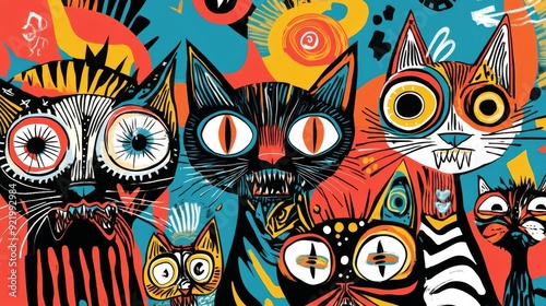 Obraz premium Group of cats posing with crazy eyes in a pop art style illustration