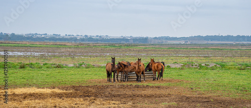 © Pedro Emanuel , Obraz premium Group of chestnut colored Lusitano horses in a rural setting