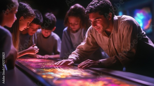 © Sam-th, Fototapeta premium Group of children learning from a teacher at an interactive display.