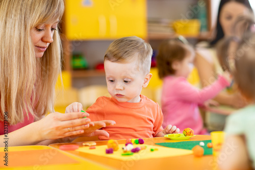 Fototapeta premium Group of children on art classes with teachers in kindergarten
