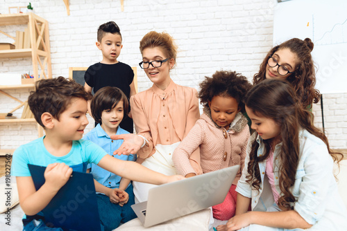 Fototapeta premium Group of children together with teacher are studying how to work with laptop.