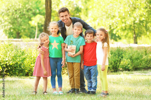 Fototapeta premium Group of children with teacher in park on sunny day