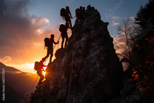 Fototapeta premium group of climbers working together to ascend a sheer rock face, highlighting...