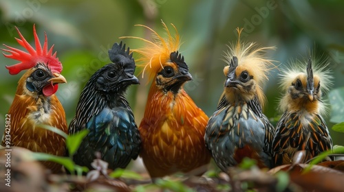 © AS Photo Family, Fototapeta premium Group of colorful bantams standing together in a lush garden setting