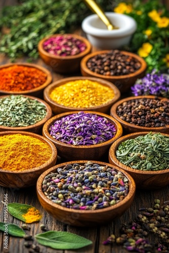 Fototapeta premium Group of colorful wooden bowls with dry ingredients provides a cozy yet organic aesthetic; perfect for culinary beauty or herbalism based projects.