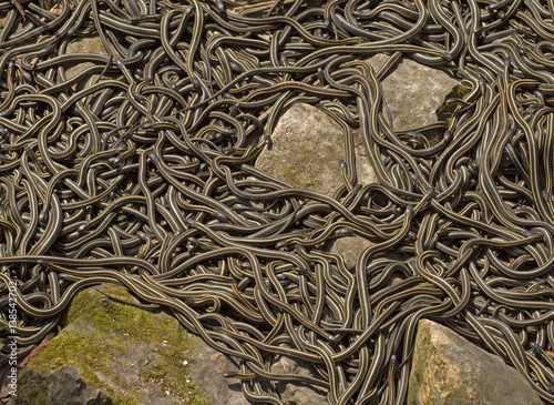 Naklejka premium Group of common garter snakes (sub species red sided garter snake Thamnophis sirtalis parietalis) mating in Narcisse Snake Dens, Manitoba, Canada.