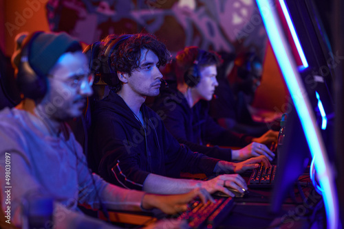 Obraz premium Group of concentrated young men in headsets sitting in row and playing video games in esports bar