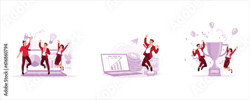 © berkah design, Fototapeta premium Group of creative young people celebrating the success of the idea. Portrait of a happy young businessman increasing company profit. Beautiful women and men can be seen jumping with trophies